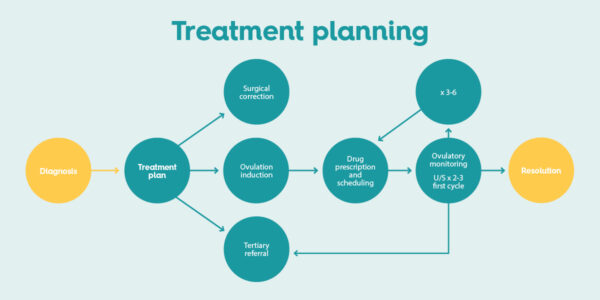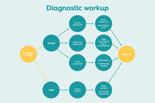 Tests include: semen analysis; blood tests for ovarian reserve; a scan; a tubal patency assessment; and an in-depth consultation with a Bourn Hall fertility specialist consultant. The following flow charts detail the referral, diagnostic and treatment pathways: