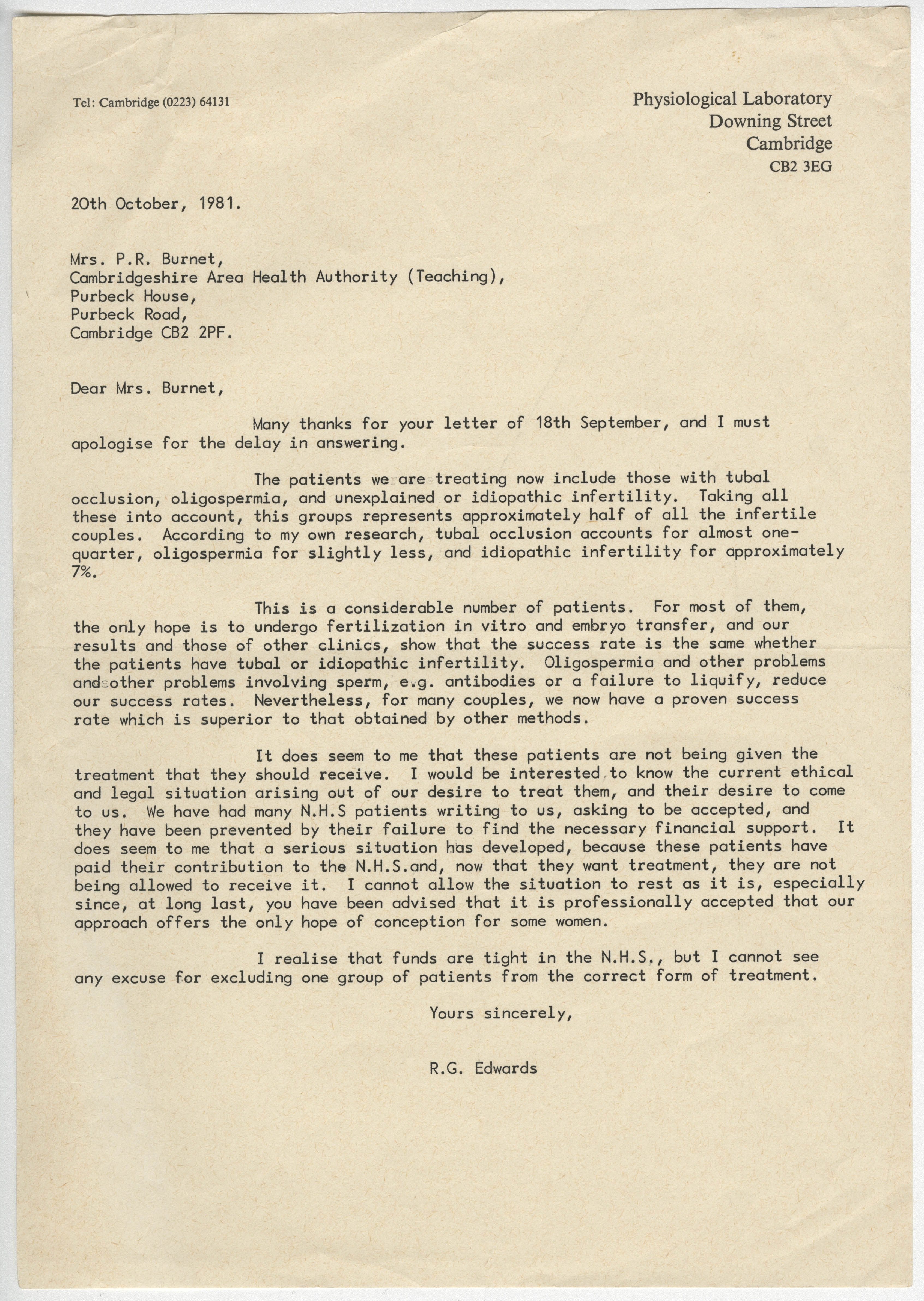 Edwards was concerned about this and wrote a letter to the health authority in 1981: ‘…these patients have paid their contribution to the NHS and, now they want treatment, they are not being allowed to receive it. I cannot allow this situation to rest as it is, especially since, at long last you have been advised that it is professionally accepted that our approach offers the only hope of conception for some women… I cannot see any excuse for excluding one group of patients from the correct form of treatment.’